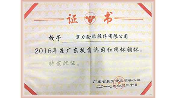 Wanli's counterpart in the village of Qingxi Village, Yingde City. We earnestly implements the poverty alleviation work. Wanli Tire was awarded the "Guangdong Poverty Alleviation Cotton Tree Cup Bronze Cup Award" for its outstanding contribution to the cause of poverty alleviation in Guangdong in 2016.