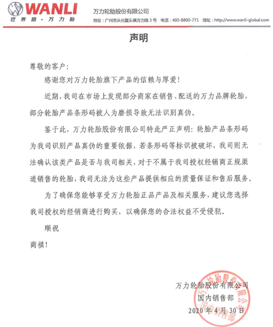 最后,萬力輪胎提醒各位消費(fèi)者:輪胎的質(zhì)量關(guān)乎車主的生命安全,請(qǐng)?jiān)谌f力的門店及經(jīng)萬力授權(quán)的正規(guī)渠道購買輪胎產(chǎn)品!